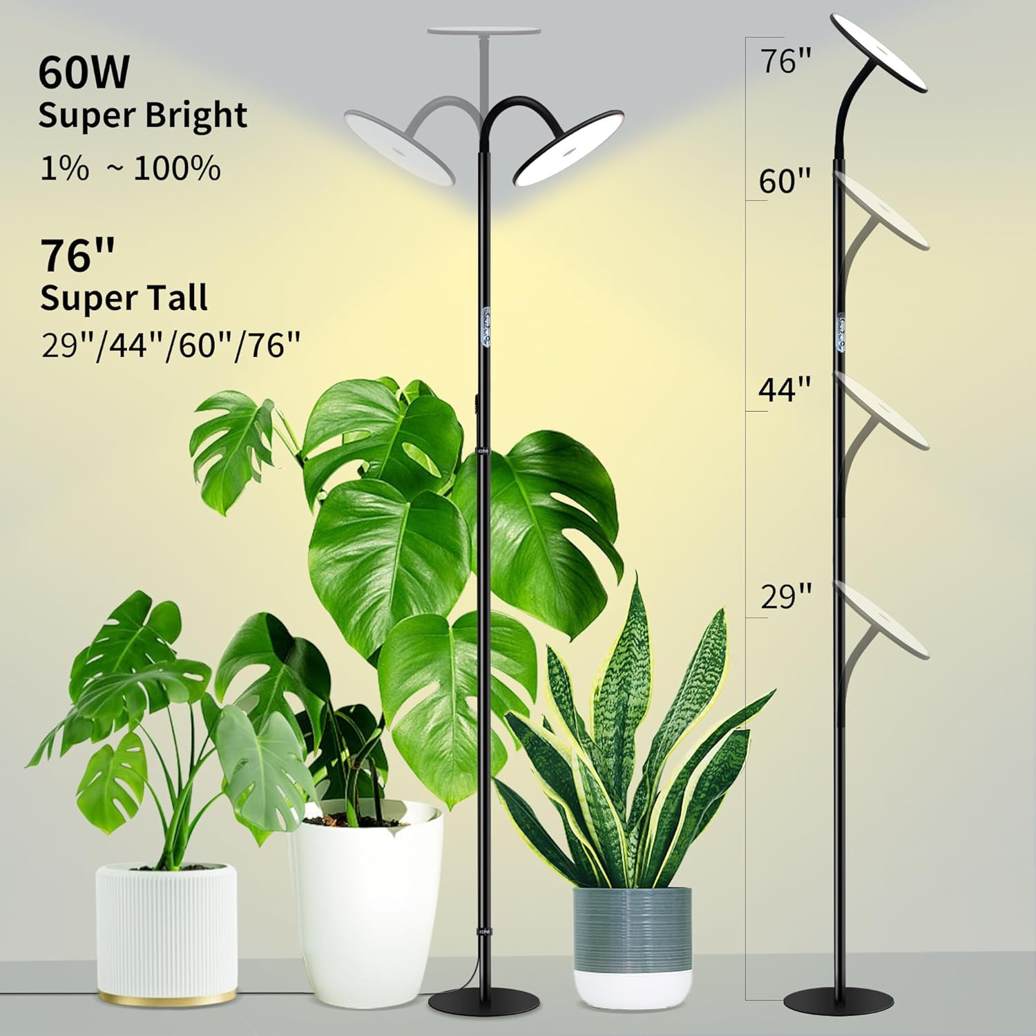chiphy Grow Lamp, 60W Full Spectrum Grow Lights for Indoor Plants, 4/8/12H Timer, 2300K-6500K, 10 Dimmable Brigntness, 76'' Height Adjustable, Remote Control, Ideal for Tall Large Plants