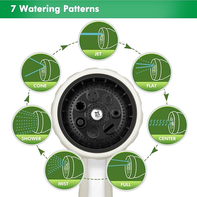 • 7 WATERING PATTERNS – Rotate the sprayer head dial to select a water pattern from Shower, Jet, Flat, Center, Cone, Full and Mist. Whether you need the high-pressure jet to clean your window and roof, or the soft shower to water the hanging baskets, the 7 patterns have you covered.