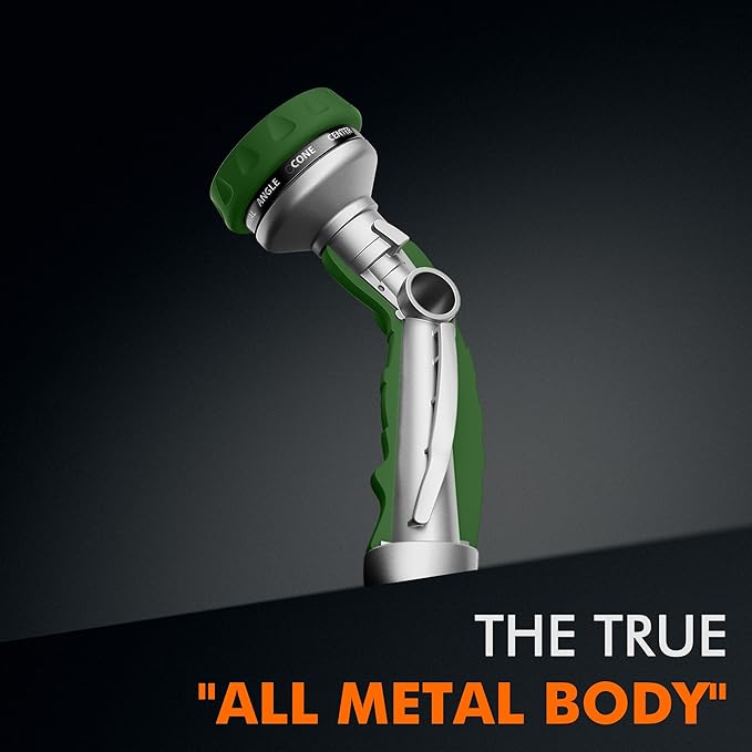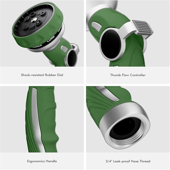 • 【Heavy Duty Metal Hose Nozzle】Constructed with premium zinc-alloy material, this hose nozzle sprayer is solid & strong to resist daily drops and shocks. The bronze powder painting, TPU coating and rubberized bezel dial can enhance durability & flexibility and withstand hard impacts & heavy force. A long-lasting garden hose nozzle you can count on many years.
