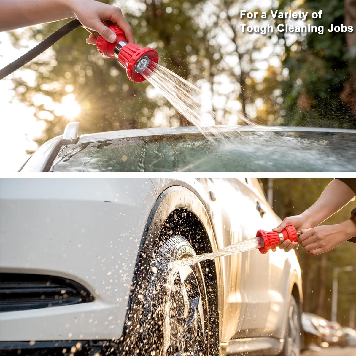 • STEP-LESS ADJUSTMENT: The fireman hose nozzle can cover all of your watering requirements and save water. Easily twist the forward grip to sprays any pattern from light mist, powerful jet stream, and fine gentle fan of water. The adjustable settings provide pretty water pressure for car washing, watering garden or lawn, cleaning the porch, walkway windows or driveway, dogs or any other pets shower.