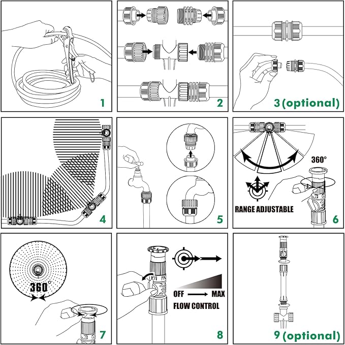 • 【Packing List】This ULTRA-FLEXIBLE ARC-N-RANGE SPRINKLER SET includes: 3 x 360° adjustable sprinklers, 3 x 5-inch riser, 1 x 30ft 1/2” garden hose, 1 x 3-way hose connector, 3 x 1/2” male thread hose connector, 2 x 1/2” female thread hose connector, 1 x 1/2” hose extender, 2 x end cap.
