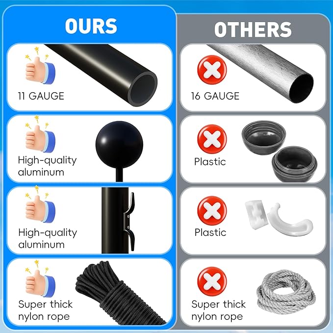 • High-Quality Material: Our 11 gauge heavy-duty flagpole is made from premium aluminum alloy with a specially designed thick-walled structure, ensuring it withstands harsh outdoor conditions without warping or rusting. It’s built to last through both cold winters and hot summers. Perfect for homes, yards, parks, businesses, and more, showcasing your patriotic spirit