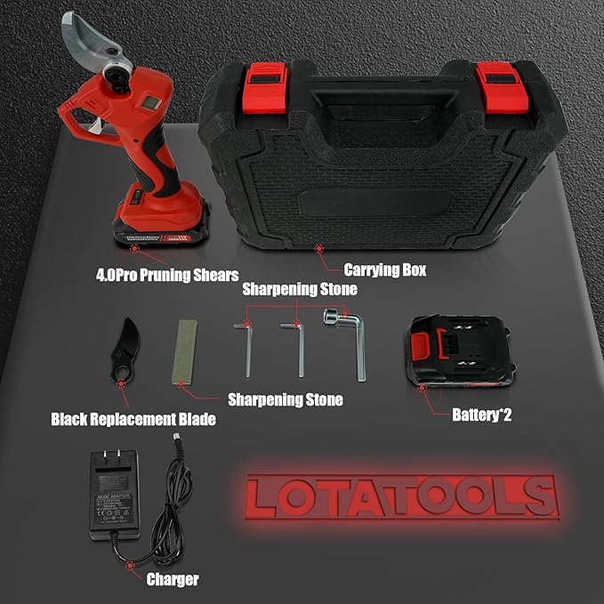 • Wide Application: The electric pruners have a wide range of applications. They can be used in gardens, parks, farms, orchards, greenhouses, etc. They can be used to trim grapevines, cherry trees, apple trees, etc. They are 8-10 times more efficient than manual pruning shears.Package Contents: Small Wrench x 3, Sharpening Stone x 1, Electric Shear x 1, Replacement Blades x 1 Pair, Battery x 2, Adapter x 1, Gloves x 1 Pair, Use manual x 1, Storage Case x1.