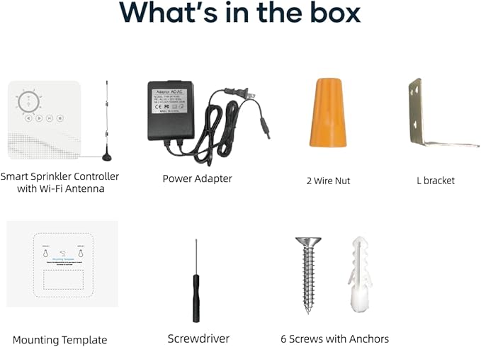 • What You Get: 1 Smart Sprinkler Controller, 1 Power Adapter,6 Screws with Anchors, 1 Mounting Template. User manual and friendly customer service.