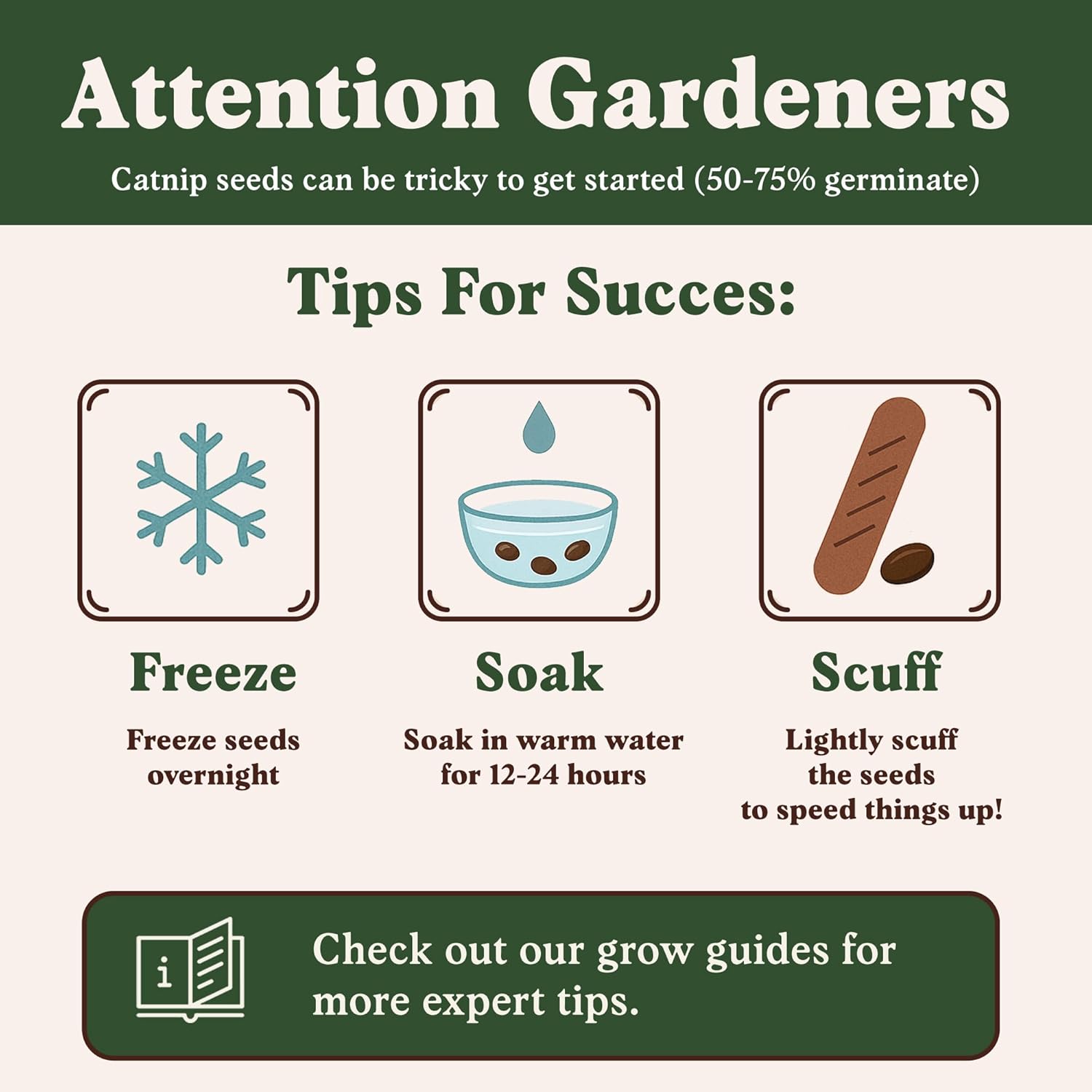 • Attention Gardeners! - Catnip seeds can be finicky (50-75% germination). Boost success by freezing overnight, then soaking in warm water for 12-24 hours. Lightly scuffing the seeds can speed things up! Check out our downloadable grow guides for more expert tips.