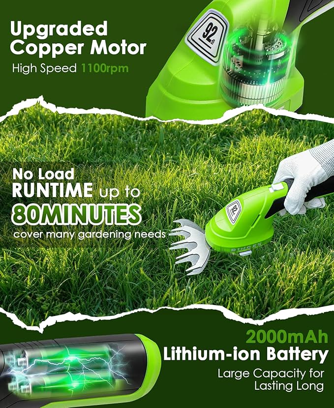 • 【Powerful Performance】- The built-in large-capacity 2000mAh battery provides strong power support, ensuring that a single charge can meet the needs of long-term pruning; The no-load runtime of this grass trimmer is up to 80 minutes and can continue to operate for 45-60 minutes in actual cutting