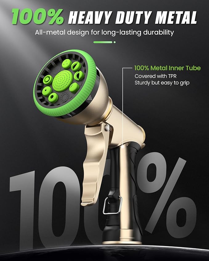 RAINPOINT Garden Hose Nozzle, Heavy Duty Metal Water Hose Sprayer Nozzle with 9 Adjustable Spray Patterns, High Pressure Hand Sprayer for Watering Plants, Lawns, Car and Pet Washing (1, Green)