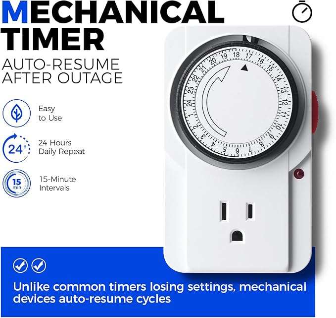 • Precision Timer Control for Effortless Operation: Our LED grow light is equipped with a mechanical outlet timer for precise lighting when you're away. Set it once for a 24-hour cycle with on/off intervals as short as 15 minutes. After programming, your plants are automatically taken care of daily, without the need for manual adjustments