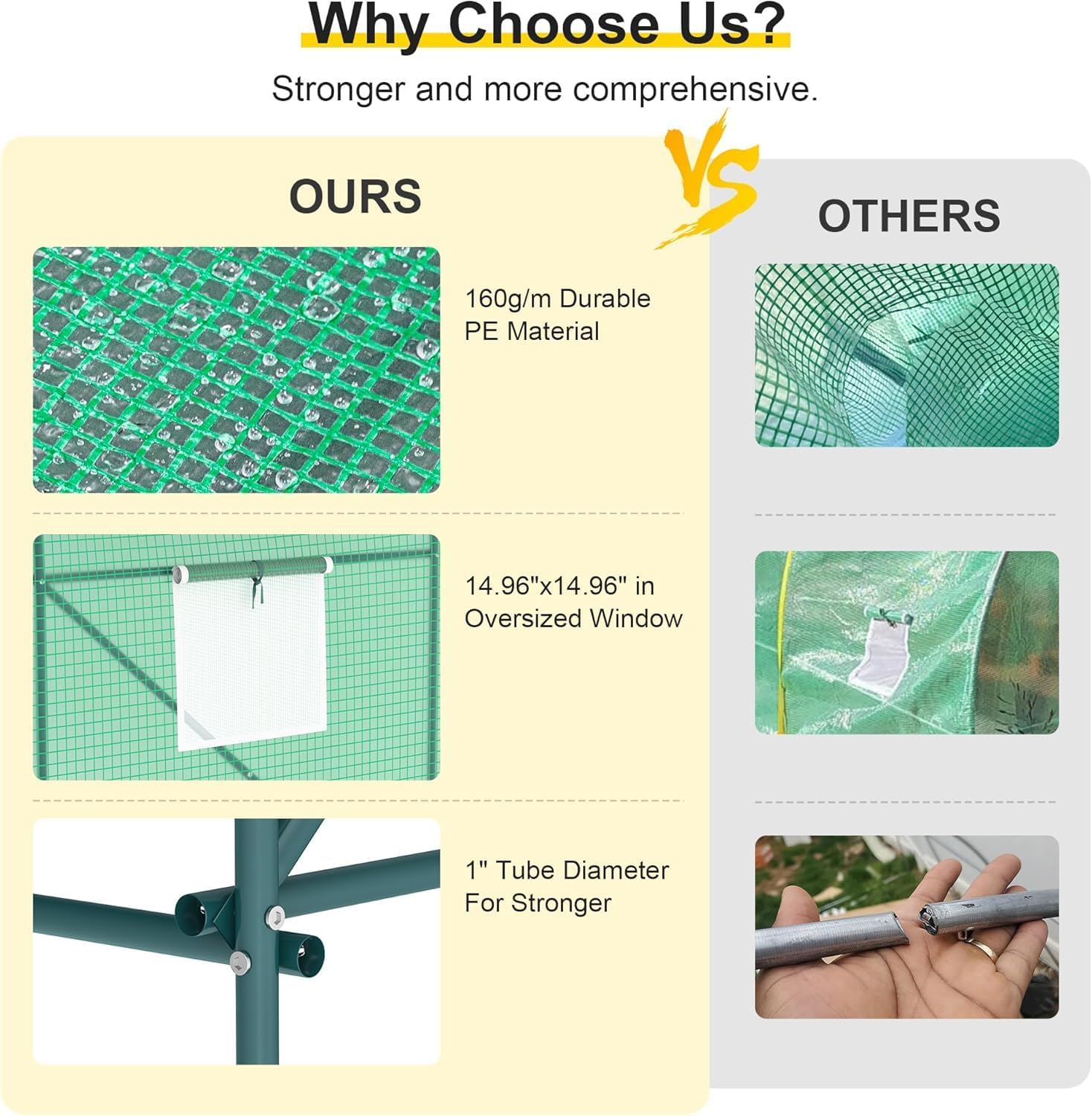 • 【Heavy Duty Galvanized Frame】We have upgraded the load-bearing bar of the warming house, using high quality galvanized material to increase a certain amount of load-bearing; the horizontal bar and 4 diagonal bars greatly improve the stability of the tunnel green house.