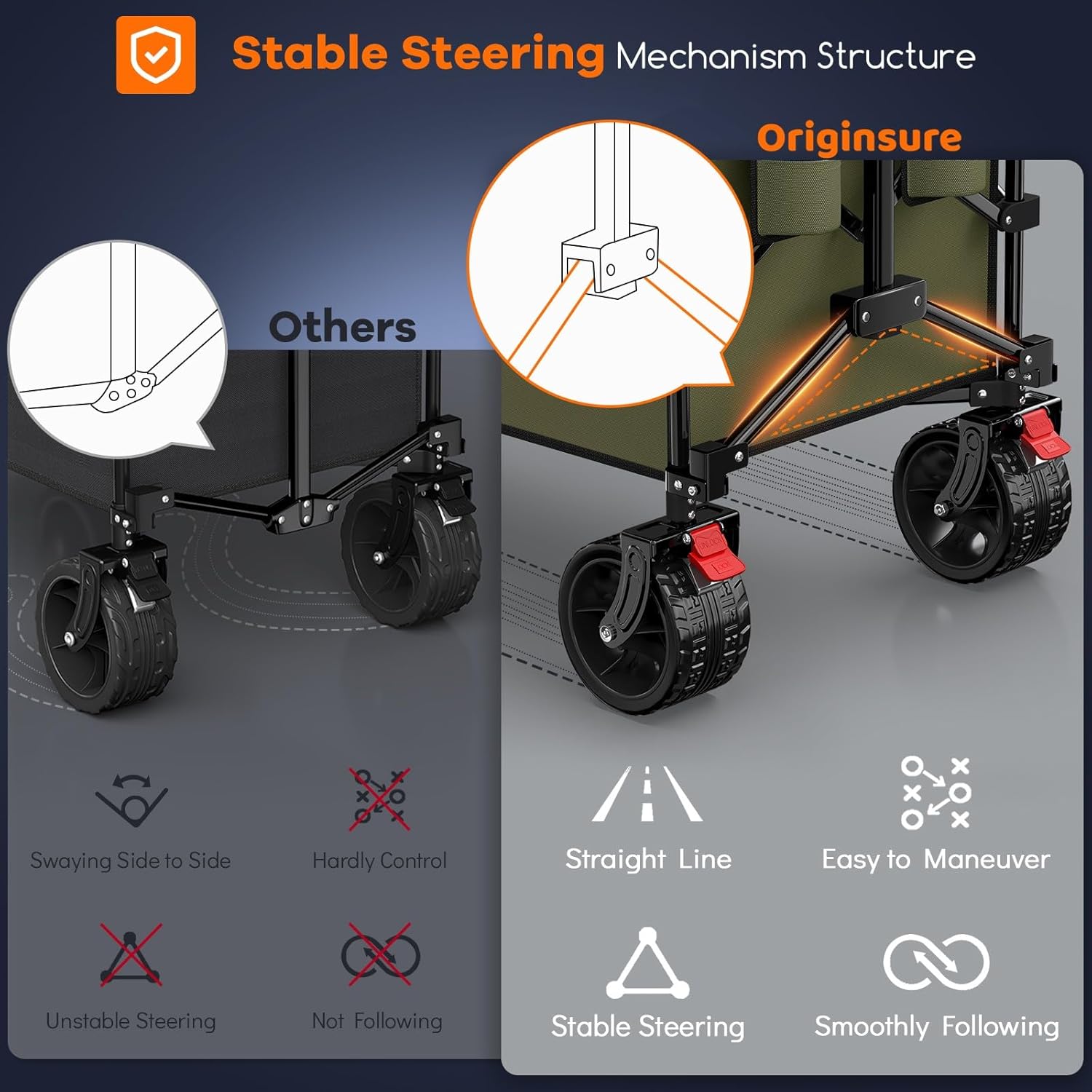- 【𝗣𝗮𝘁𝗲𝗻𝘁𝗲𝗱 𝗦𝘁𝗮𝗯𝗹𝗲 𝗦𝘁𝗲𝗲𝗿𝗶𝗻𝗴 𝗠𝗲𝗰𝗵𝗮𝗻𝗶𝘀𝗺 & 𝗔𝗱𝗷𝘂𝘀𝘁𝗮𝗯𝗹𝗲 𝗥𝗲𝗯𝗼𝘂𝗻𝗱𝗮𝗯𝗹𝗲 𝗛𝗮𝗻𝗱𝗹𝗲 𝗙𝗼𝗹𝗱𝗶𝗻𝗴 𝗪𝗮𝗴𝗼𝗻 𝗖𝗮𝗿𝘁】This foldable cart features an stable innovative steering mechanism structure, Restoring the swaying 3-point handle-frame connection, resolving the problems of swaying side to side, loss of control, and steering difficulties of similar carts, significantly enhanced stability and maneuverability. A rebound adjustable handle with the lock can be freely adjusted in length, suitable for all types of people.