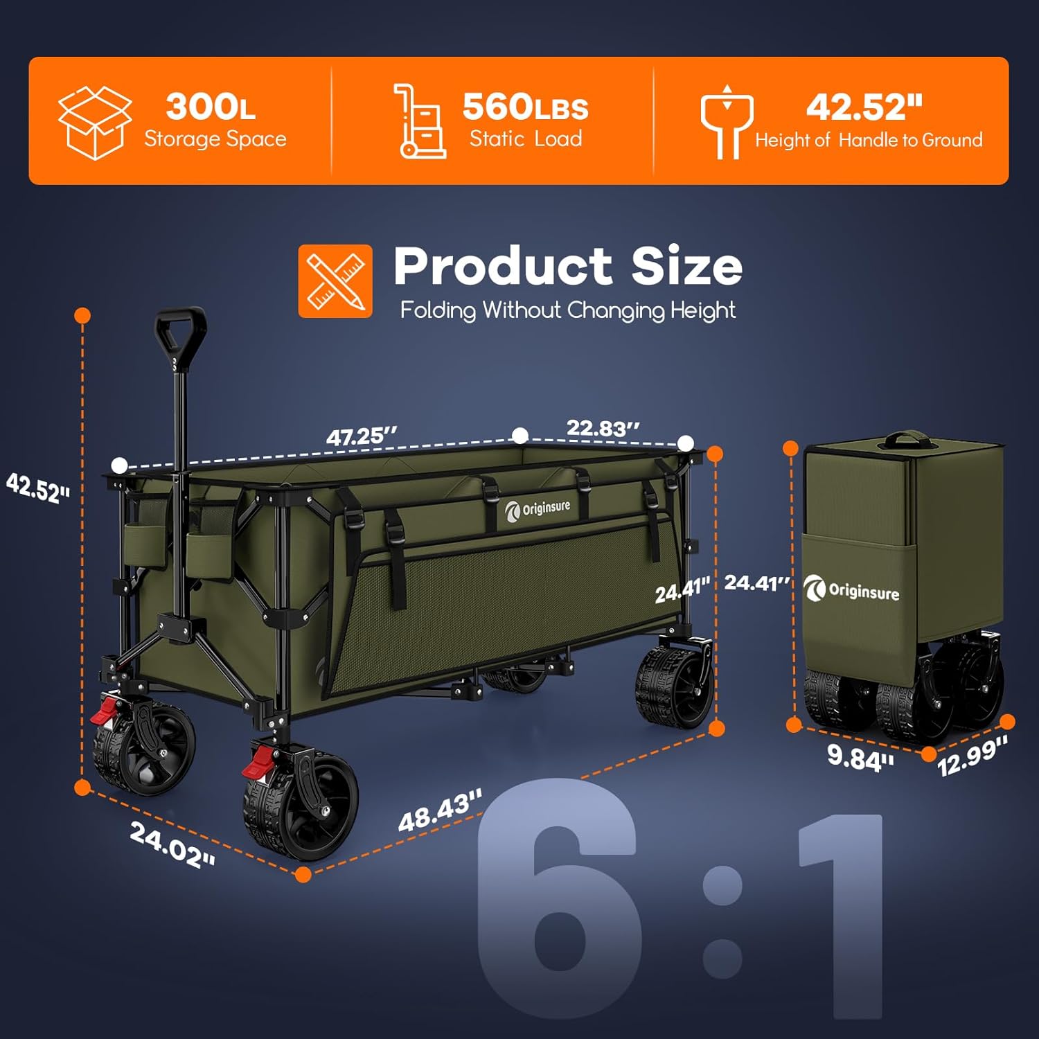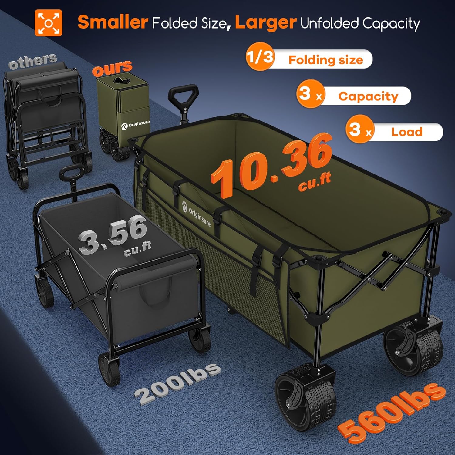 - 【𝟭𝟬.𝟯𝟲 𝗰𝘂 𝗳𝘁 𝗟𝗮𝗿𝗴𝗲 𝗖𝗮𝗽𝗮𝗰𝗶𝘁𝘆 𝘄𝗶𝘁𝗵 𝗦𝗺𝗮𝗹𝗹𝗲𝗿 𝗙𝗼𝗹𝗱𝗲𝗱 𝗦𝗶𝘇𝗲 𝗣𝗼𝗿𝘁𝗮𝗯𝗹𝗲 𝗖𝗼𝗹𝗹𝗮𝗽𝘀𝗶𝗯𝗹𝗲 𝗕𝗲𝗮𝗰𝗵 𝗪𝗮𝗴𝗼𝗻】Originsure foldable wagon cart, 48.43 "L x 24.02 "W x 24.41 "H large unfolding size, 10.36 cu ft/300L massive storage space, triple the capacity of similar wagons. Adopting an innovative folding design that maintains its height, the Capacity reduces to 1.36 cu ft when folded, only 1/3 of other carts. Compact and space-saving, it can be perfectly stored in the car trunk and room corners.
