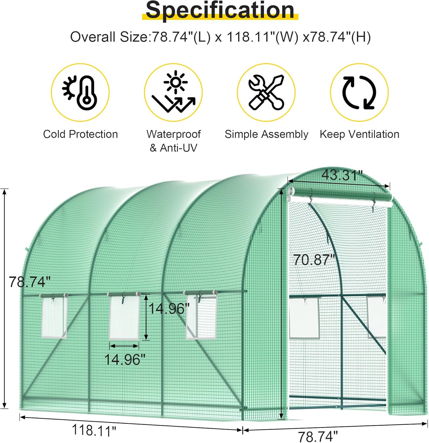 • 【Double Zipper Roll-up Door】The front door of the hoop greenhouse is equipped with 1 screen door to prevent small insects from flying in and harming your plants; another PE door is used for heat preservation.