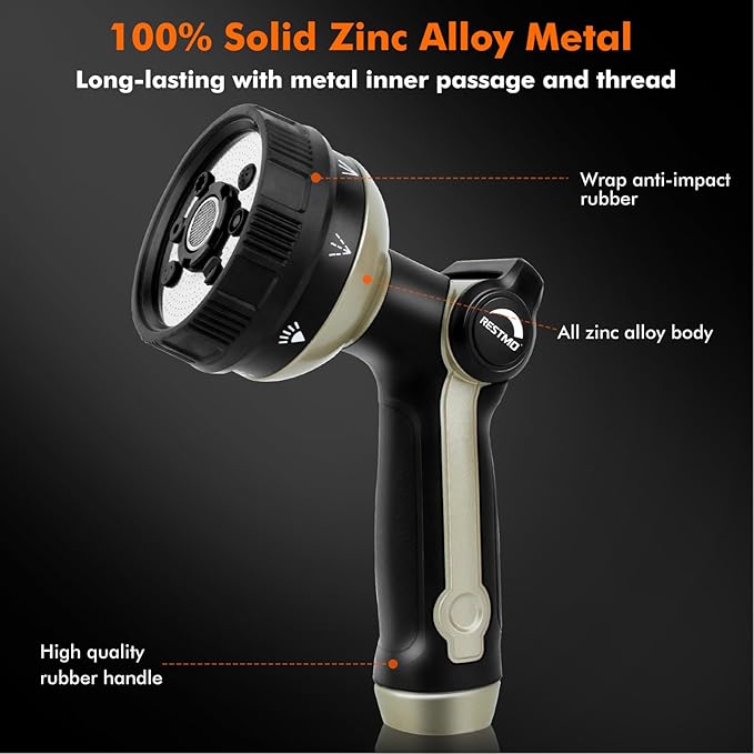 • Heavy Duty Metal Hose Nozzle: Constructed with premium zinc-alloy material, this hose nozzle sprayer is solid & strong to resist daily drops and shocks. The bronze powder painting, TPU coating and rubberized bezel dial can enhance durability & flexibility and withstand hard impacts & heavy force. A long-lasting garden hose nozzle you can count on many years.