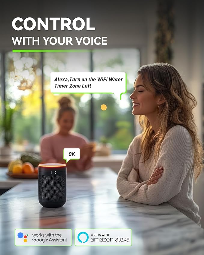 - 【Voice Control】The WiFi irrigation controller is compatible with Alexa and Google Assistant and can be controlled via voice commands. This smart water valve has a wide range of applications and is ideal for lawns, gardens, patios, greenhouses, flower beds, pool filling, and misting system irrigation.