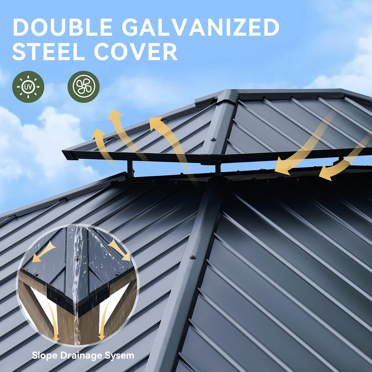 Aoxun 10' x 12' Outdoor Wood Gazebo, Hardtop Gazebo Permanent Wooden Pavilion with Galvanized Steel Double Roof, for Patio, Garden, Deck, Cedar Wood