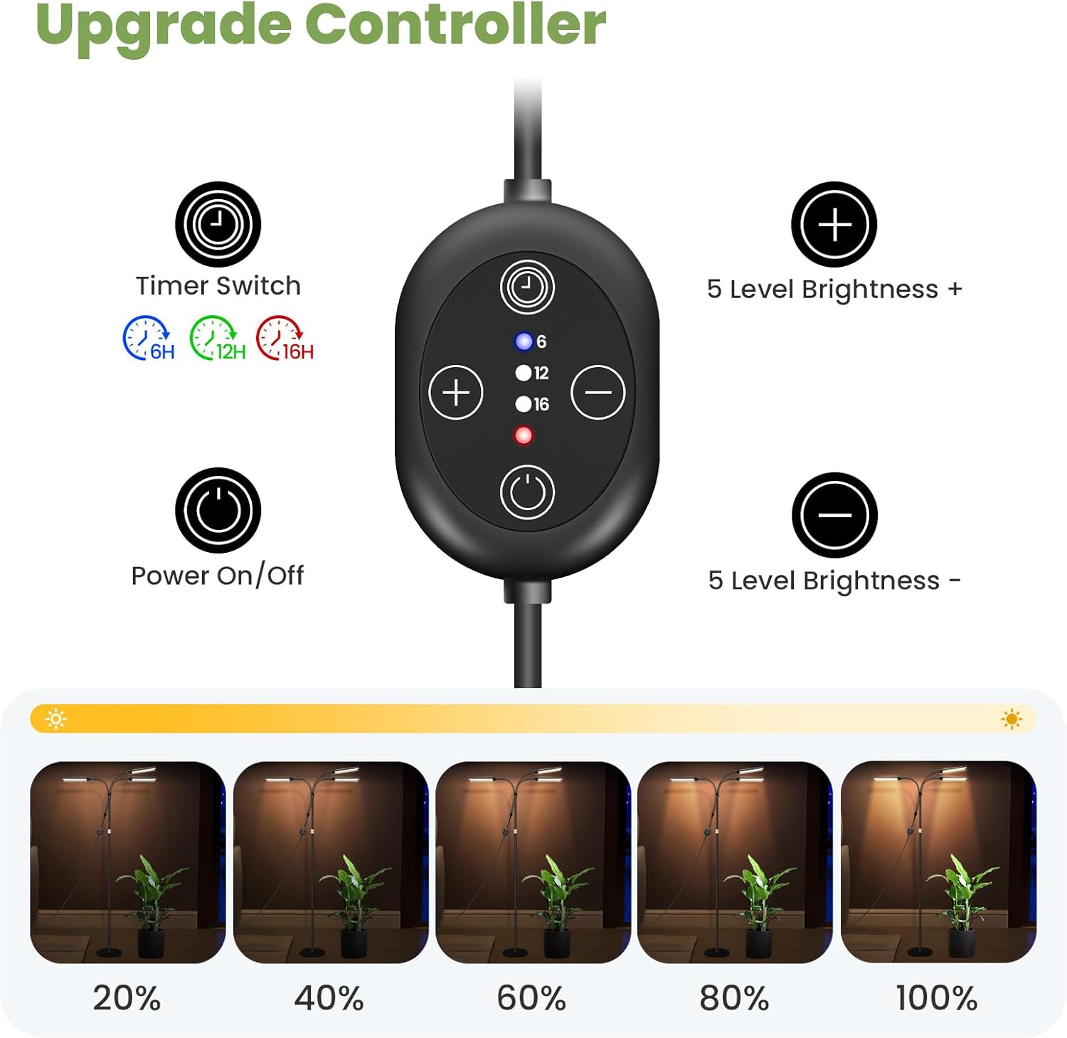 • SMART CONTROLLER WITH AUTO TIMER:Features a 6H/12H/16H automatic cycle timer, ensuring your plant lamp turns on/off at the same time daily. Simply press once to start the cycle—no need for manual resetting. Comes with 5 brightness levels and stepless dimming, allowing precise light intensity control for different growth stages.