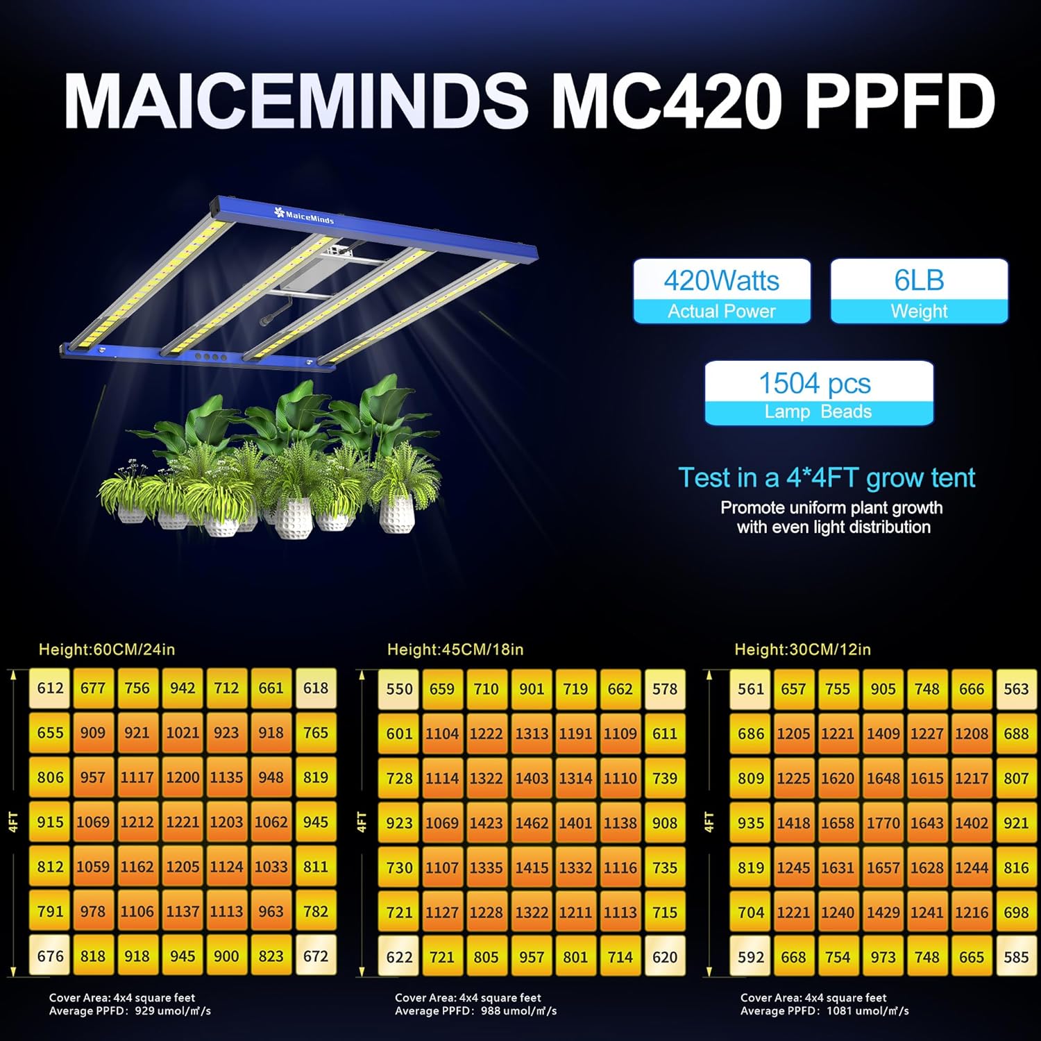 • 【High efficiency and economy】MaiceMinds MC420 plant lights for indoor growing Uses 1504 beads, with average PPFD of 1080 μmol/㎡/s and peak core PPFD of 1770 μmol/㎡/s in a 12in high 4x4ft coverage area.MC420 plant grow lights indoor With high energy efficiency of 2.8μmol/J, you can grow more plants with less electricity.