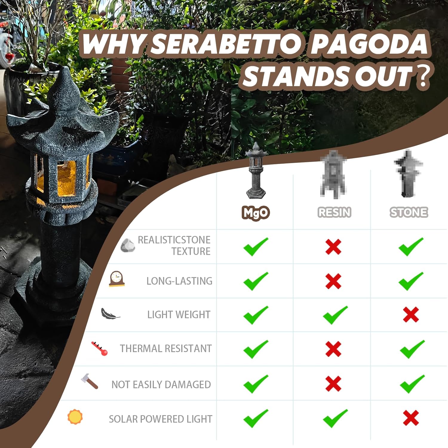 • ⛩️【Solar Pagoda Accent】: Gently illuminates gardens with ambient golden glow (300-500 lux), auto-activated at dusk. Weatherproof craftsmanship blends tradition and eco-friendly charm
