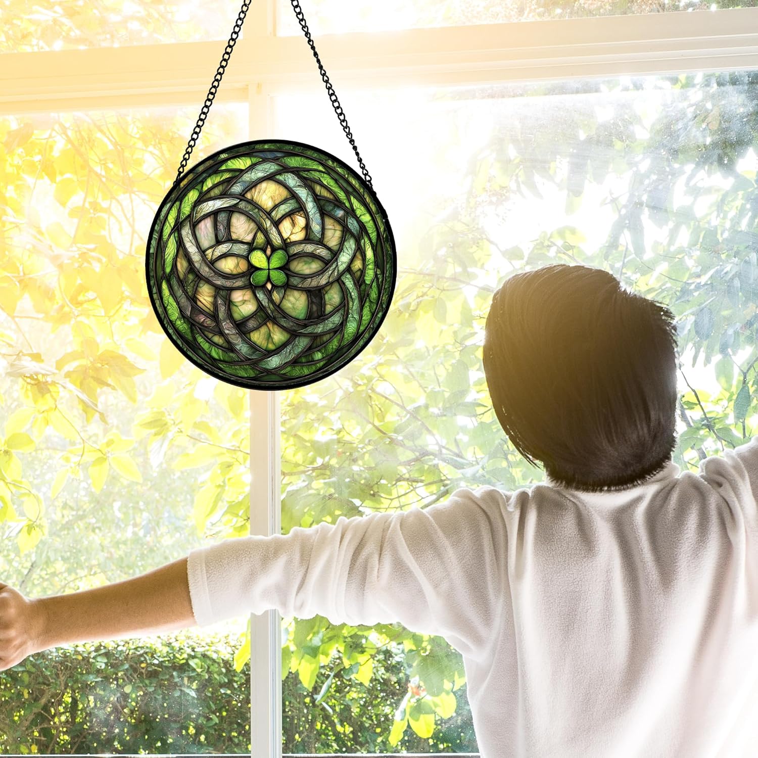 Stained Glass Window Hanging, Abstract Green Clover Sun Catchers Colorful Glass Panel Bless Suncatcher Decor for Birthday for Women, Men, Wife, Aunt, and Mom 6.3 in