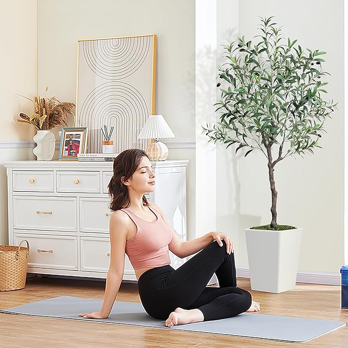 • Lifelike Artificial Olive Tree: This realistic olive tree features natural wood trunks, lifelike leaves, and detailed faux olives. Crafted from high-quality silk, it’s designed to maintain its vibrant appearance over time without fading, warping, or shedding. Plus, it’s pet-friendly, making it ideal for families with pets