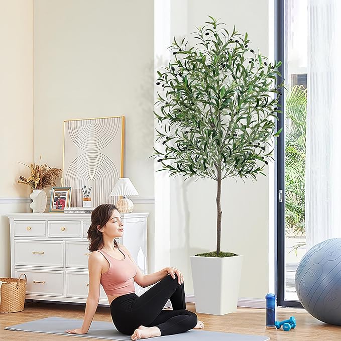 • Lifelike Artificial Olive Tree: This realistic olive tree features natural wood trunks, lifelike leaves, and detailed faux olives. Crafted from high-quality silk, it’s designed to maintain its vibrant appearance over time without fading, warping, or shedding. Plus, it’s pet-friendly, making it ideal for families with pets