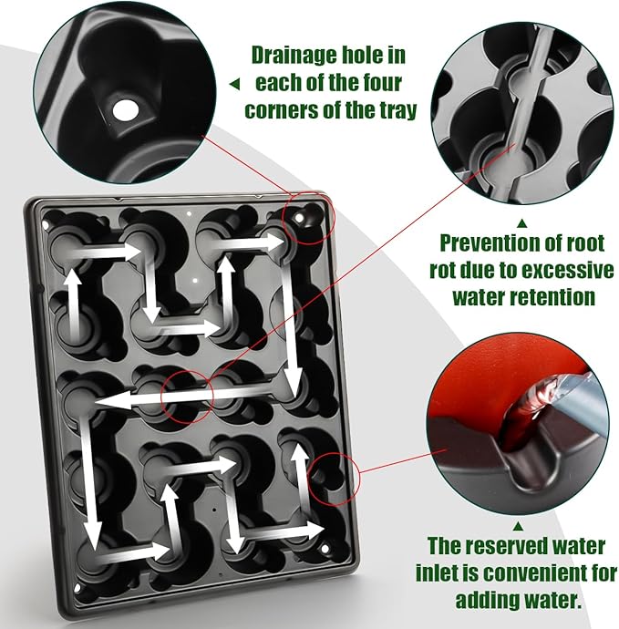 • 【Improved Airflow for Healthier Roots】Each compartment in the seed starting trays features a 0.2-inch gap between the bottom of the pot and the base of the plant tray, promoting better airflow to the soil. This helps increase soil aeration and prevents waterlogging, contributing to stronger, healthier root systems.