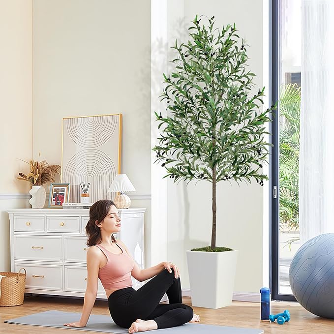 • Lifelike Artificial Olive Tree: This realistic olive tree features natural wood trunks, lifelike leaves, and detailed faux olives. Crafted from high-quality silk, it’s designed to maintain its vibrant appearance over time without fading, warping, or shedding. Plus, it’s pet-friendly, making it ideal for families with pets