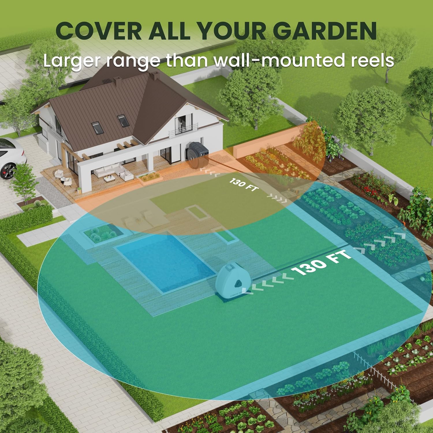 • WIDER COVERAGE, INVISIBLE STORAGE - This ground-mount reel enjoys 20% more coverage than wall-mounted rivals. Hide the reel discreetly behind plants, pull out the hose and lock at any length as you wish. A reel that hides as well as it works!