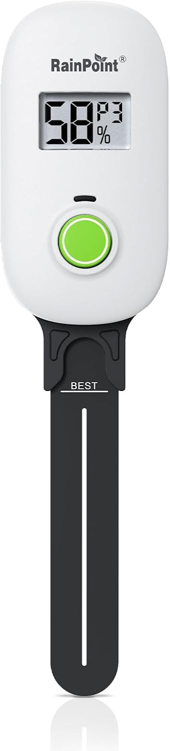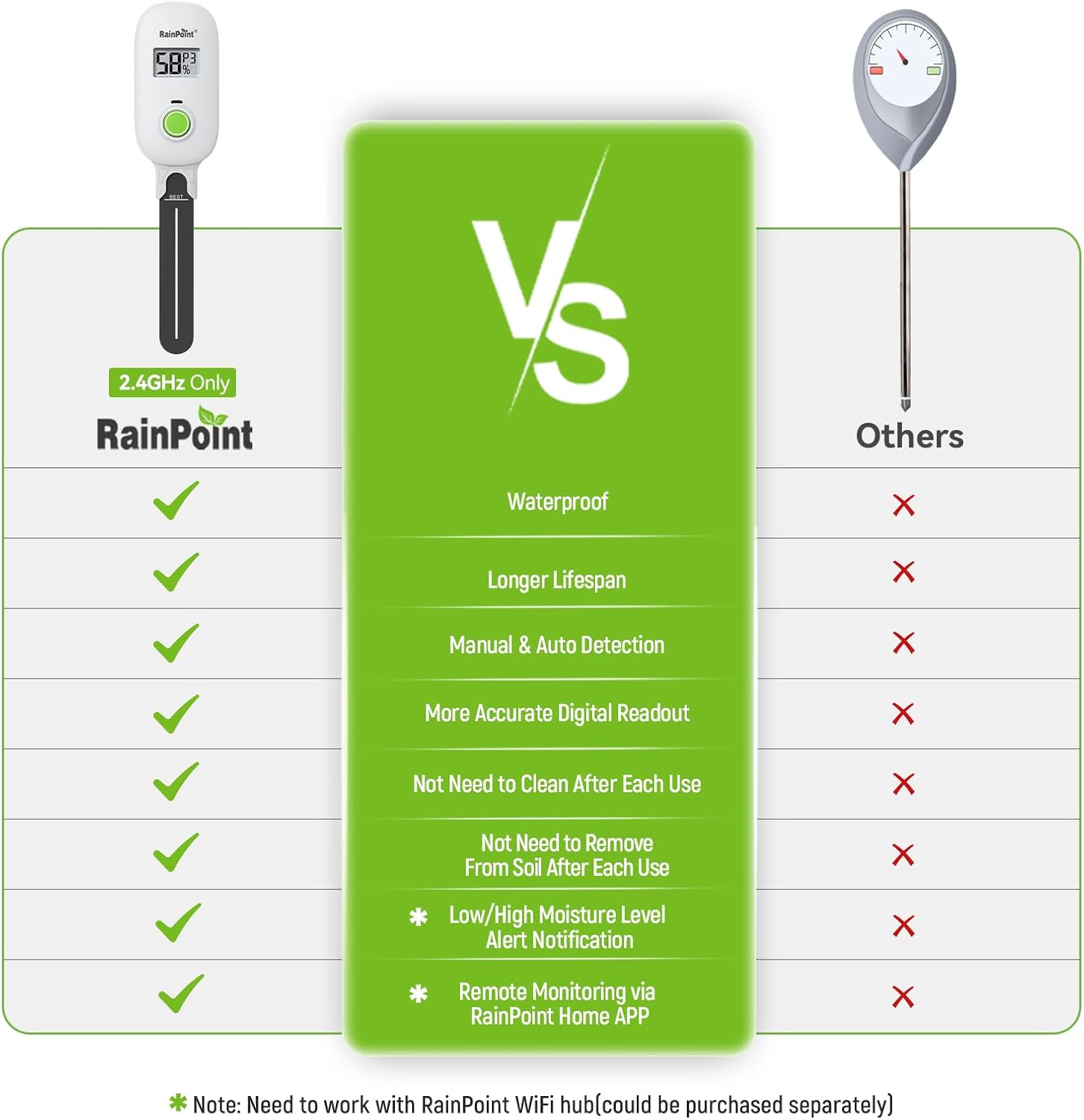 • ใ€๐Ÿš€Capacitive Probeใ€‘Unlike traditional resistive probes which are prone to rust causing resuced accuracy, our RAINPOINT high-precision soil senor maps moisture with a long-lifespan capacitive probe. Easily know your pothos is thirsty before it droops, or your peppers need a drink without digging.