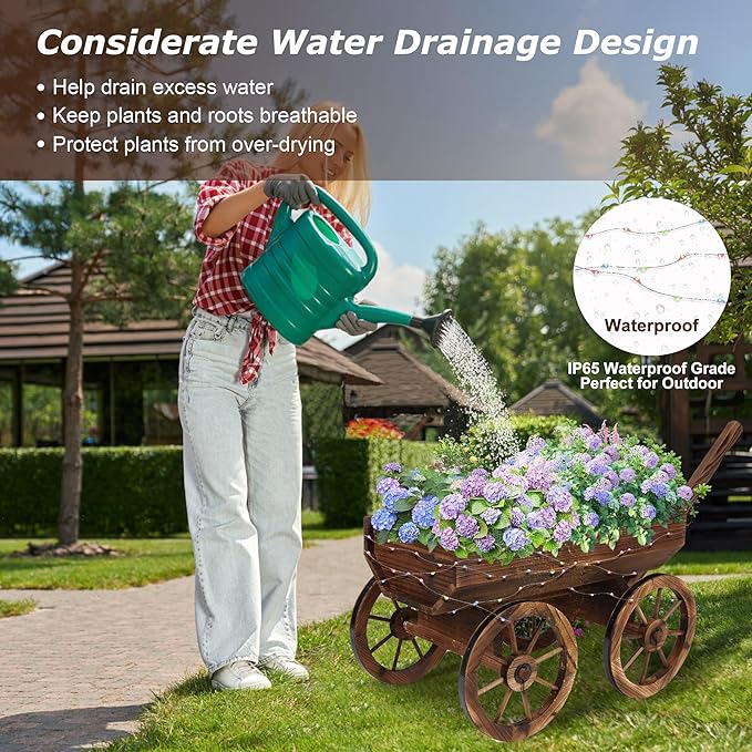 • 【LONG-LASTING】: Made of high quality fir wood, this wagon planter ensures long-lasting use while complementing your outdoor space. In addition, the hub has iron reinforcement for long-lasting use.