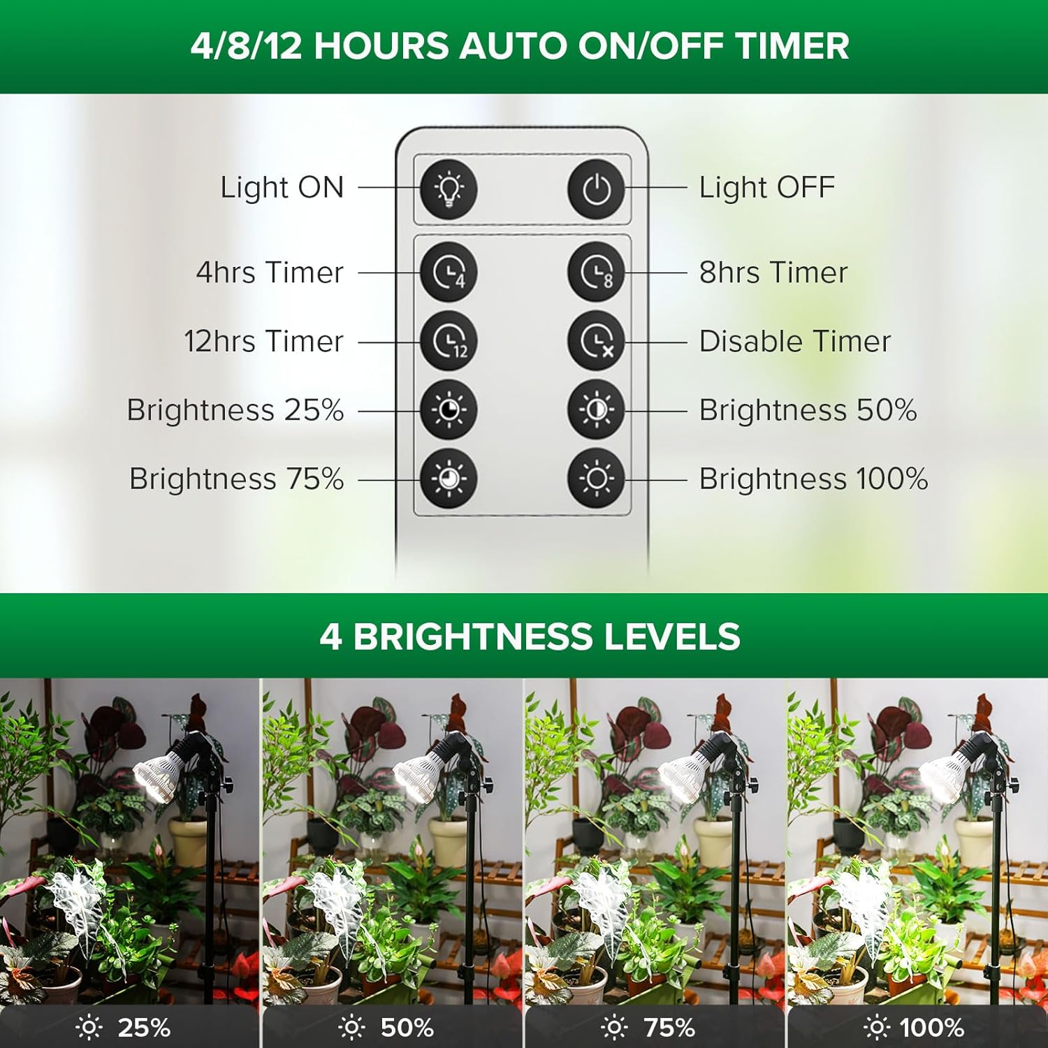 - Remote Control & Timer: Introducing the ultimate convenience for your indoor gardening needs—a remote control grow light! With the included remote, effortlessly control the timing and brightness levels from the comfort of your chair. Choose from 4, 8, or 12-hour timing cycles, and select from four dimming brightness levels ranging from 25% to 100%, tailored to your plants’ specific requirements. If there is a power outage or the power is unplugged, the timer function will need to be reset
