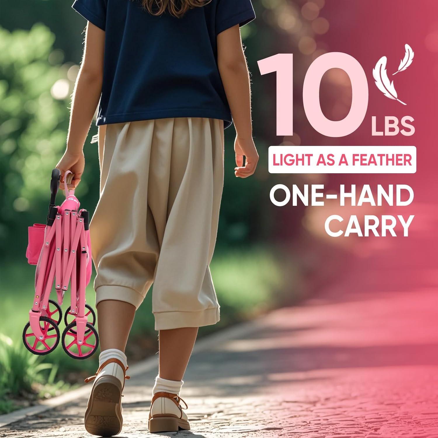 Heavy Duty Wagon with Big Wheels, Foldable Cart with 220LBS Capacity, Utility Lightweight Wagon, Collapsible Grocery Shopping Cart for Camping Sports & Holiday. Pink