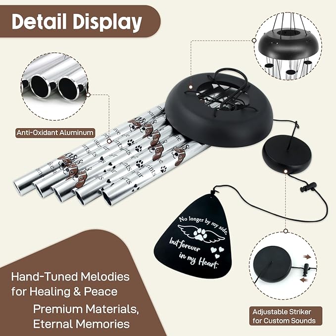 • 【Natural Stress Reliever】Designed to bring peace and comfort, our pet memorial wind chimes feature expertly tuned tubes that produce gentle, harmonious melodies. These soothing tones create a tranquil atmosphere, helping to ease grief and bring moments of calm as you remember your beloved companion.