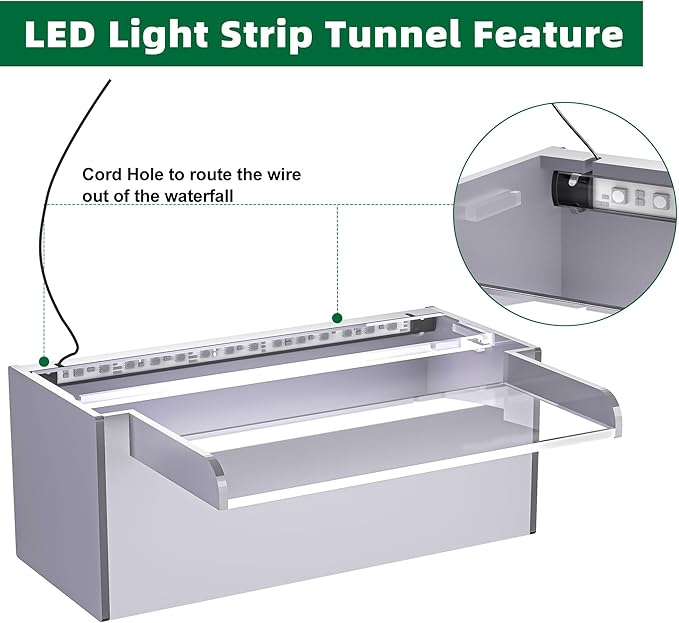 • 【Enhanced Upgrade Design】- This upgraded design includes a specialized channel for the LED light strip and two cable outlets to neatly route power cables, keeping them hidden from view. Ideal for those who want to add an LED light strip separately. To further enhance functionality and efficiency, a splash guard has been integrated at the open top of the waterfall. Additionally, a precisely positioned baffle at the water inlet ensures regulated and optimized water flow, creating an appealing visual effect while reducing unwanted splashing.