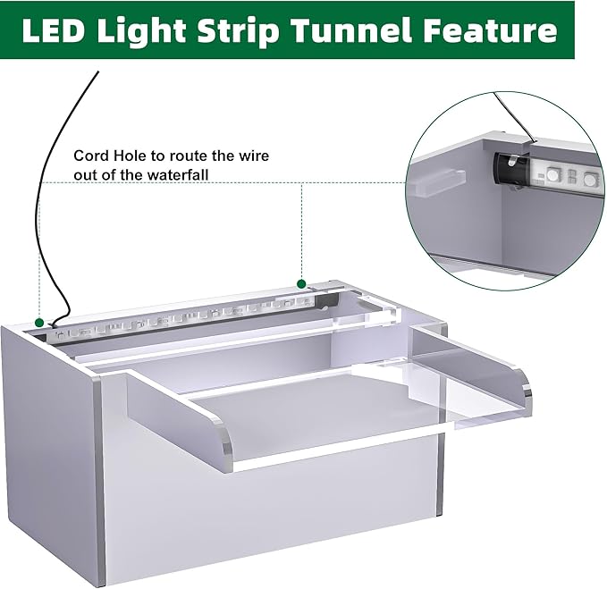 • 【Enhanced Upgrade Design】- This upgraded design includes a specialized channel for the LED light strip and two cable outlets to neatly route power cables, keeping them hidden from view. Ideal for those who want to add an LED light strip separately. To further enhance functionality and efficiency, a splash guard has been integrated at the open top of the waterfall. Additionally, a precisely positioned baffle at the water inlet ensures regulated and optimized water flow, creating an appealing visual effect while reducing unwanted splashing.