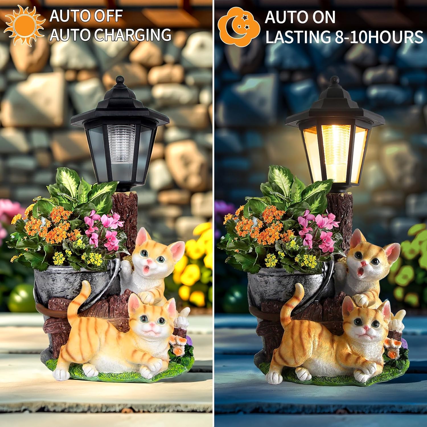 Solar Cat Outdoor Statues, Garden Sculptures with Flowerpot Decor & Solar Lantern for Yard Art Lawn Ornaments Porch Patio Balcony - Idea Gifts for Women Mom Grandma
