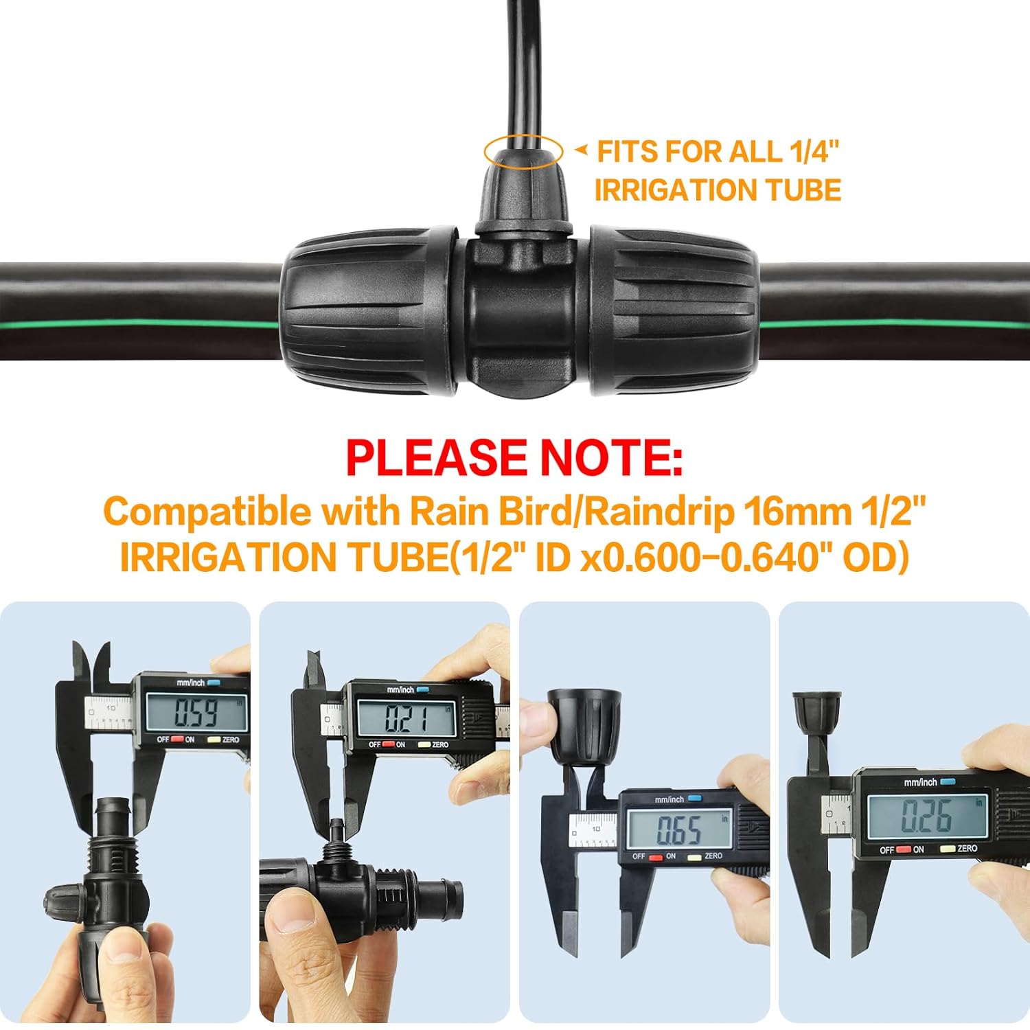 • 【Fits 1/2 Inch Drip Irrigation Tubing】:These 1/2 drip line irrigation connectors are compatible with Rain Bird / Raindrip 1/2" drip irrigation tubing (1/2" ID x 0.640" OD)