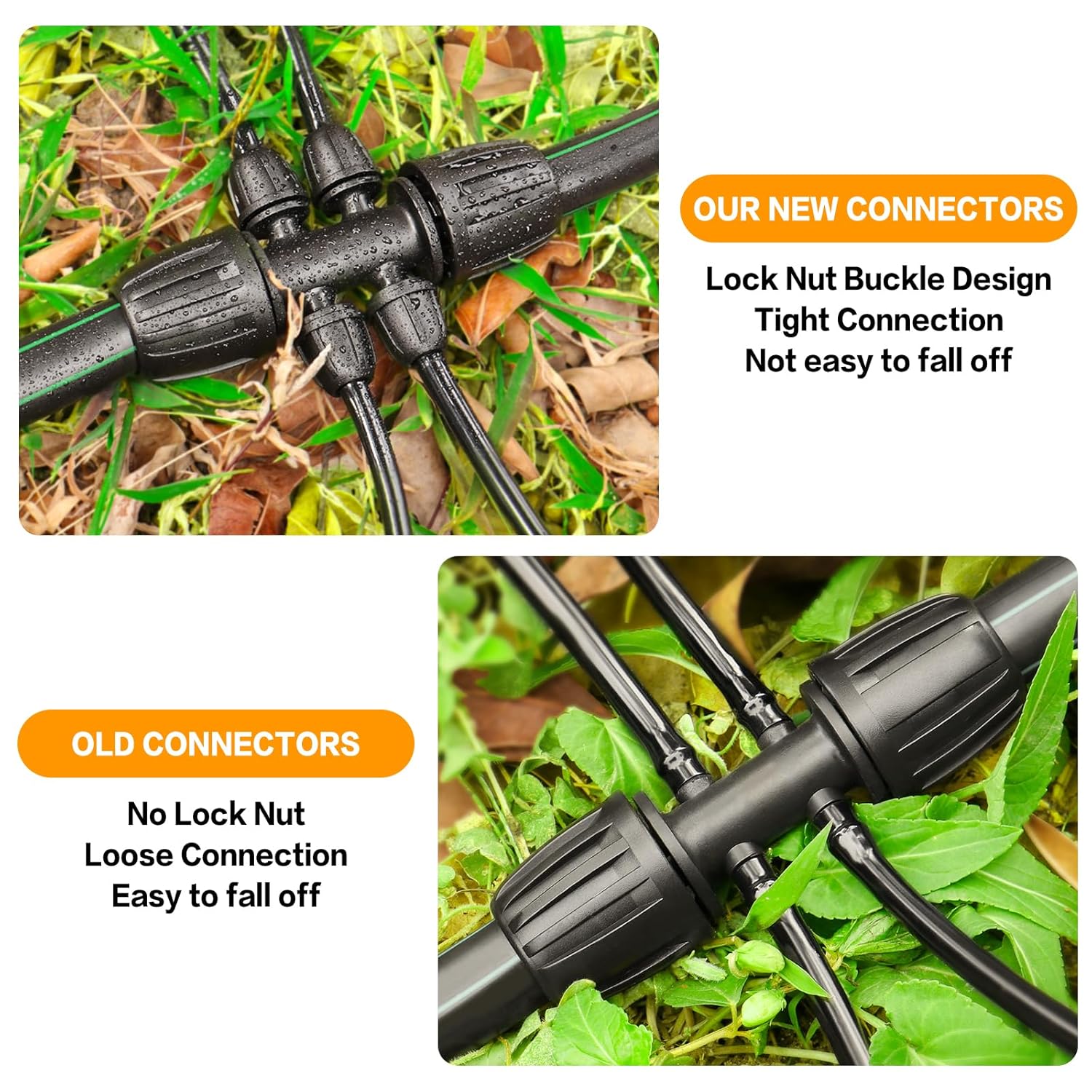 • EASY TO INSTALL: Simply push the tubing over the 1/2 and 1/4 barbed connector, the protruding barbed ends can grab drip irrigation tubing tightly for a secure leak-proof connection. Then tighten the threaded nuts to fasten drip tubing for double protection