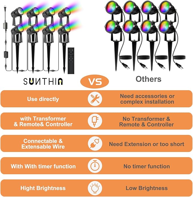 • 【Timer Functions】Utilize the timer feature to automatically turn the lights off at predetermined times, light up your house at night with SUNTHIN outdoor multicolour landscape lights for outdoor decoration for added convenience.