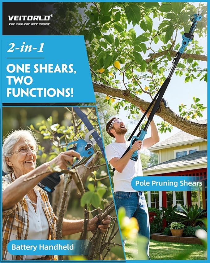 VEITORLD 2-IN-1 Cordless Electric Pole Pruning Shears, 15ft Reach, 1.2" Cutting Diameter, Battery Powered with 2 * 2.0Ah, Brushless Motor for Garden Tree Trimming, Gifts for Men Dad Him Christmas