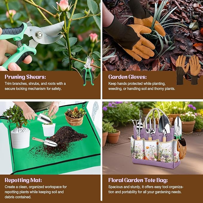 - 【Sturdy Gardening Tool Set】Gardening tools made of high-strength Stainless Steel, which is durable and rust-proof. Whether you're planting delicate seedlings or digging up stubborn weeds, our garden tools for gardening comfortable design will help you get the job done with ease. Stainless steel gardening supplies are easier to fix up your garden. With green plastic mat for repotting plants without spilling everywhere.