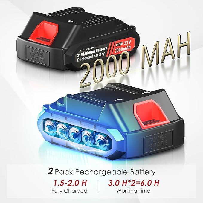 • High-Performance Battery and Power Indicator: This tree pruner comes with two 21V 2000mAh rechargeable batteries, eliminates charging worries. They all have overload and temperature protection, which extends battery life. LED screen and power indicator are included, accurately record battery level and eliminate battery anxiety.