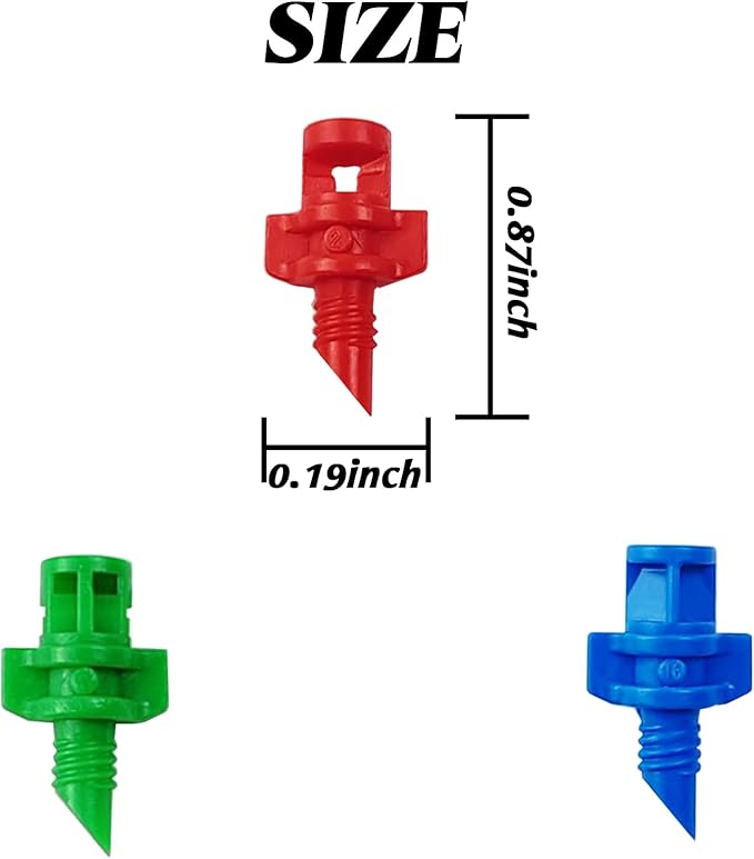 • Package include: The package contains 120pcs blue 90° misting sprinklers, 120pcs green 180° misting sprinklers, and 120pcs red 360° misting sprinklers. The size of the sprayer is 0.82 x 0.47 inches, a total of 210 drip system sprinkler heads. Sufficient for your daily use and replacement. If you have any problems, please feel free to contact us.
