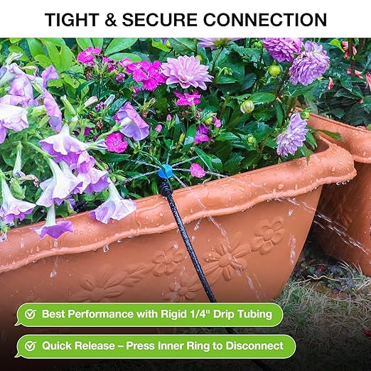 • Hassle-Free DIY Installation: Designed for standard 1/4-inch drip tubing, this kit lets you snap in adjustable drip irrigation emitters and irrigation drippers with no tools. Even a beginner can click on the drip irrigation mister heads or micro sprinkler heads and start watering in minutes. Set up your custom drip irrigation system in moments.