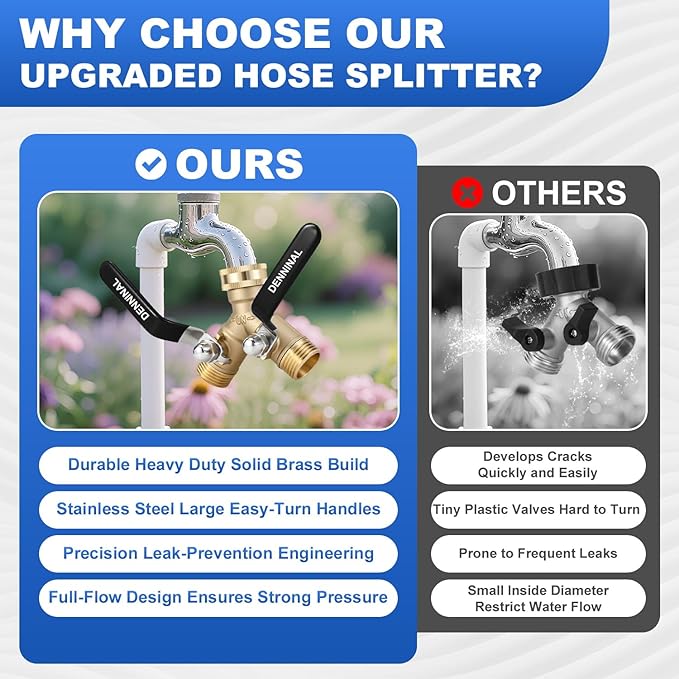 • DOUBLE THE FLOW: Connect two hoses at once without losing pressure; great for sprinklers, washing, or watering using your water hose and hose splitter 2 way heavy duty setup in the yard or driveway.