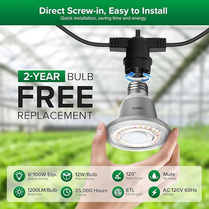 • EASY to INSTALL: The upgraded lens makes the string light effect more effective and allows your plants to grow more vigorously..Sansi waterproof grow lights for indoor plants with hooks, you can fix the grow lights for indoor plants anywhere and adjust the position of the light string worry-free. If there is a problem with one of the light bulbs, the outdoor grow lights waterproof will not affect its use