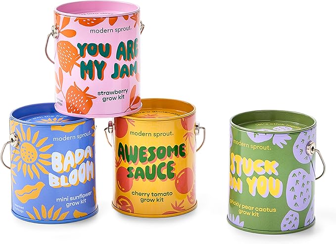 • Package Contents: Modern Sprout Complimentary Color Grow Kits Pack of 4 - Includes organic strawberry, cherry tomato, mini sunflower and pricky pear cactus seeds with expandable growing medium & simple instructions on the back of can