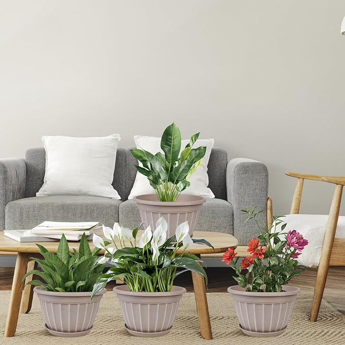FGstyle 10 Inch Plants Pot,4 Pack Flower Pots,Planters Pot with Drainage Hole & Saucer,Modern Planters for Indoor Outdoor Plants,Decorative Resin Garden Pots for Outdoor Indoor Home Plants (Beige)