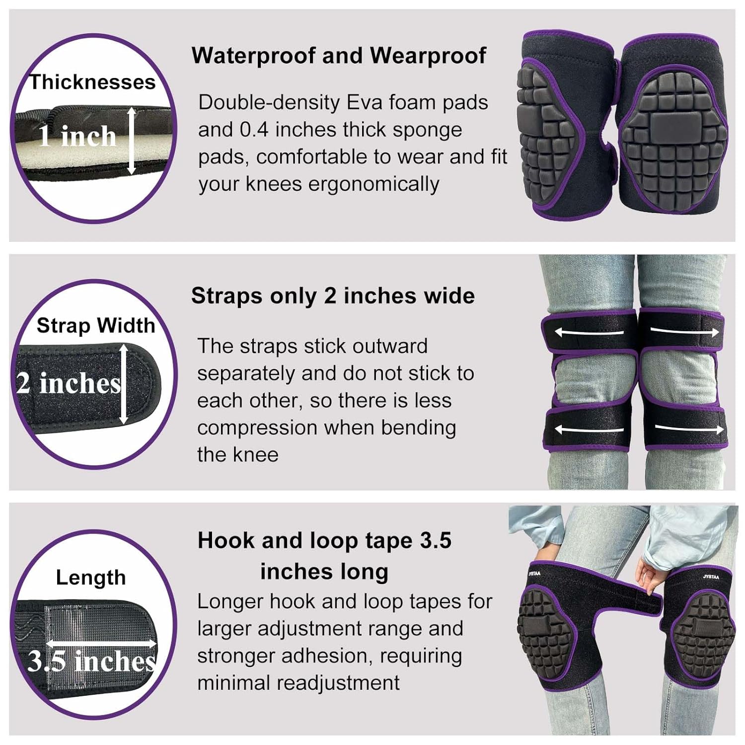 • WATERPROOF KNEE PADS - THICKER:The work knee pads are made of wear-resistant double-density EVA foam, which is waterproofcarpenter, and will not penetrate into the soft knee pads and wet your pants. In addition, an extra layer of 0.4" thick sponge padding makes your knees better protected, softer and more comfortable, making the safty crawling kneepads more durable