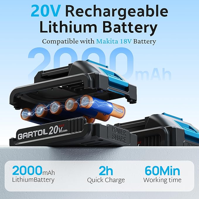 - [RELIABLE BATTERY PERFORMANCE] Powered by a 20V 2000mAh lithium-ion battery, this hedging set offers up to 45 minutes of uninterrupted use on a full 2-hour charge. It allows you to do all my trimming in one go without having to stop and recharge. The detachable battery features a built-in power level indicator to monitor usage during gardening. This battery operated gardening tool set is compatible with Makita batteries, providing added convenience and flexibility for extended use